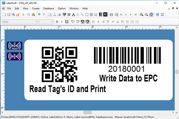 It supports reading the tag ID and converting it to text or barcode and printing it on the current label at the same time, and can write the specified data to the label.